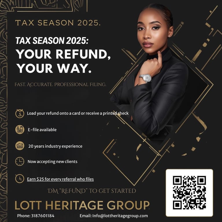 Founded by Veronica Lott, our firm was built on integrity, family values, and a passion for helping others keep more of what they earn. Whether you’re filing personal taxes, managing small business returns, or preparing for long-term stability, we make the process simple, transparent, and stress-free.