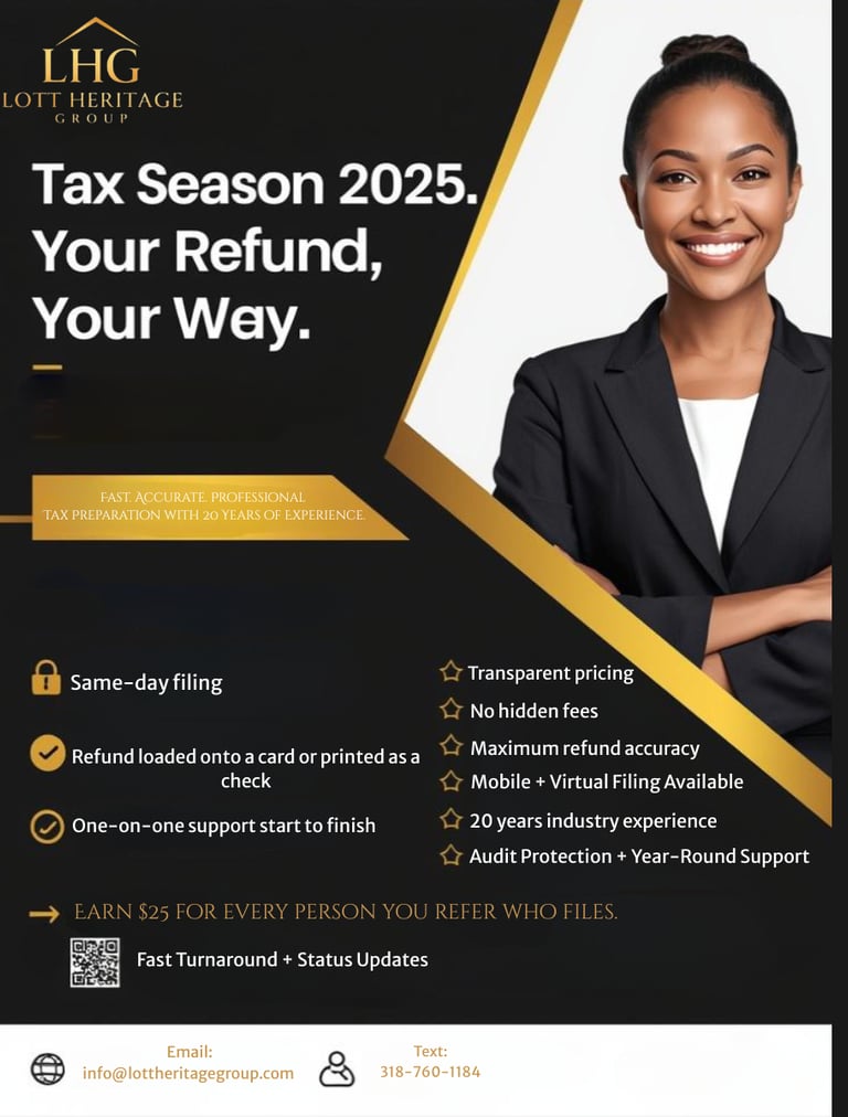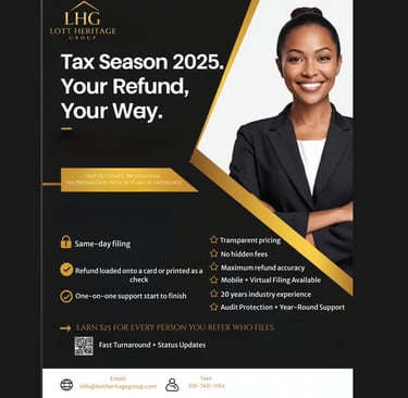 Know someone who needs their taxes done? Refer them to Lott Heritage Group and receive 25.00 for each completed return. Click Here For Your REferral LINK